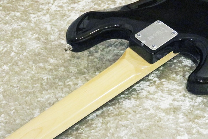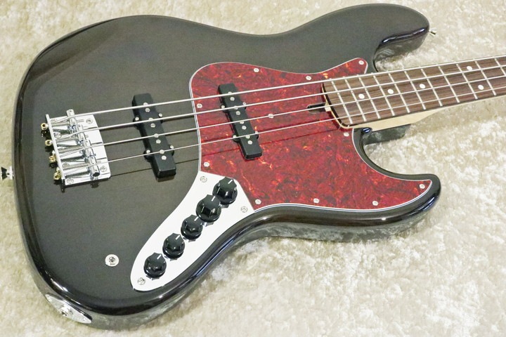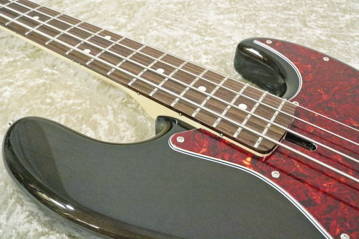 ★今回のルックスは、1ピースの木目が見えるトランスパレントブラックカラーに、赤べっ甲柄ピックガードの差し色が特徴です。