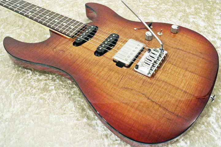 弾きやすく機能性が高い万能型ギター、JOSです。杢入りのコア材が良い雰囲気です。ネックのメイプルにもフレイム杢が出ています。ご注文いただくと、この画像の個体そのものをお届けします。