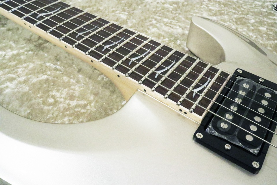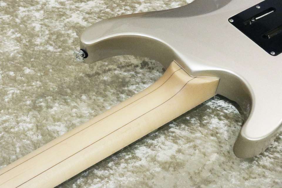 セットネック構造ですが、歯切れの良い軽快さもあり、良い感じにバランスしています。ストラト系とレスポール系の間の楽器をお探しの方は、ぜひ、ご検討ください。