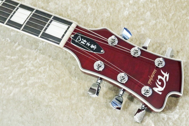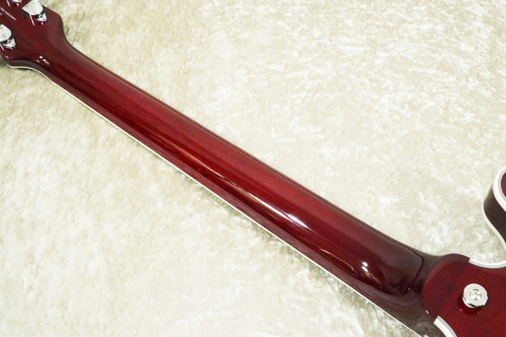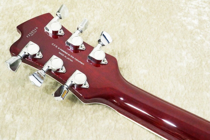 ●ボディ・トップとネックのヘッド面にフレイム・メイプルの化粧板が張られ、ワインレッド・カラーで着色されています。ぱっと見は黒っぽくも見えますが、照明が当たると赤身や木目が浮かんできて、見れば見るほど深みを感じられる外観です。