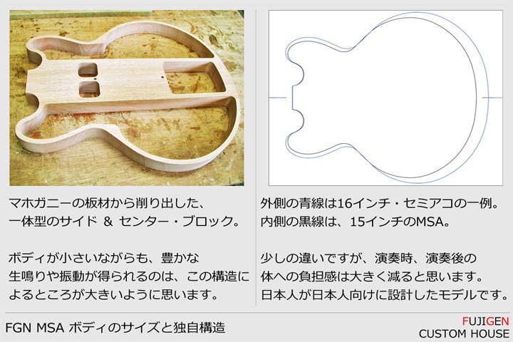 ボディのセンター・ブロックとサイド板を、板材から削り出すというユニークな構造(画像があります)で、柔らかくやさしいい木材の響きが豊かなギターです。弾いていて楽しいですよ。