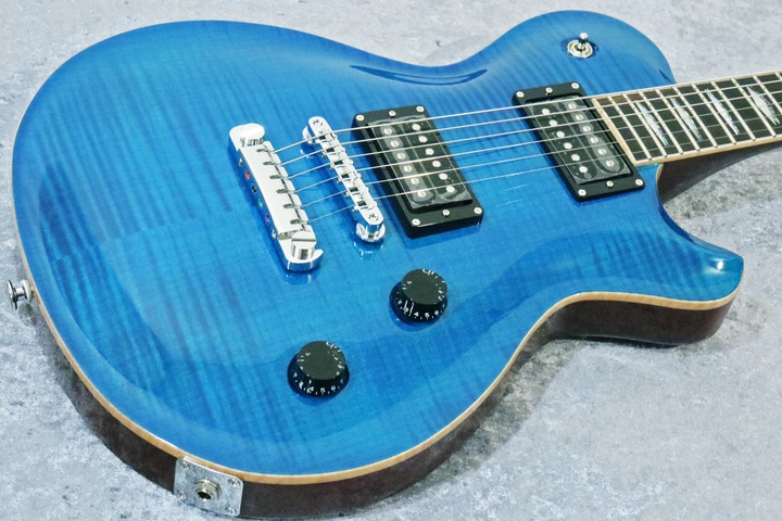 フレイム・メイプルに、木目が透けるシースルーの青色で着色した、黄金の組み合わせの FGN EFLです。実際上の利便性にフォーカスしたようなギターだと思います。【重量:4.2kg】
